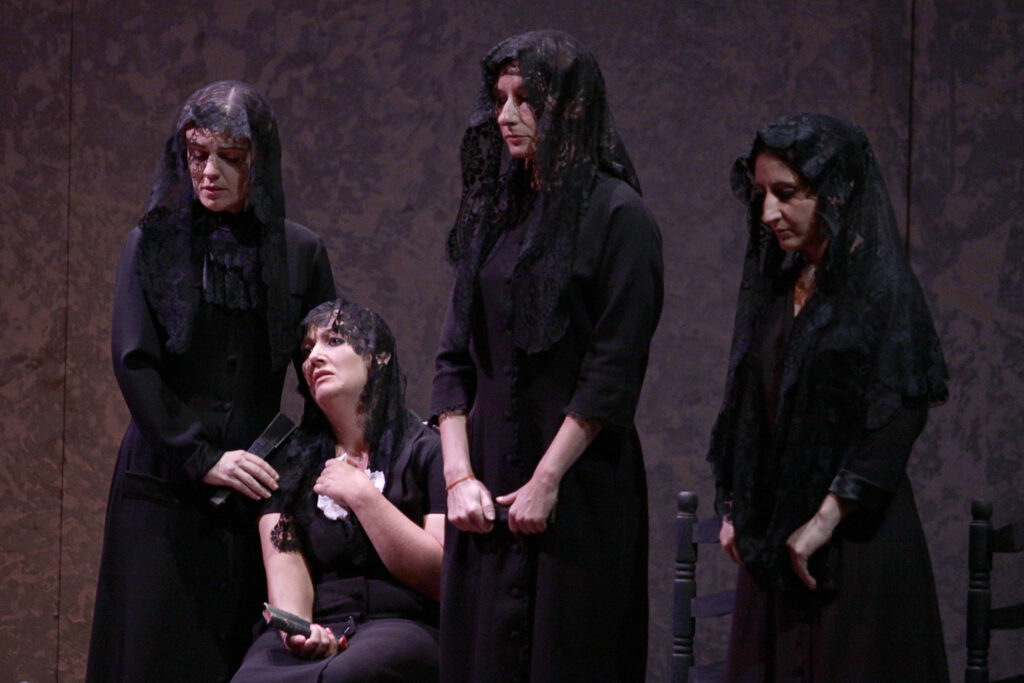 En nuestra puesta en escena hemos querido ser fieles a García Lorca. La escenografía, iluminación y vestuario buscan recrear ese mundo cerrado, laberíntico y asfixiante. Los muros físicos limitan voluntades, las puertas se abren hacia nuevas celdas, no hay salidas ni escapatorias. La escenografía se presenta rotunda, con paredes sólidas que limitan un espacio conventual, carcelario.